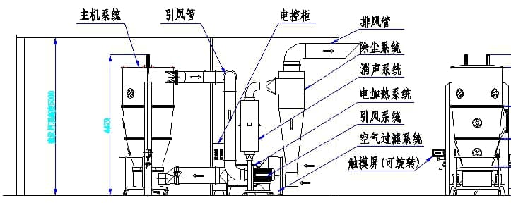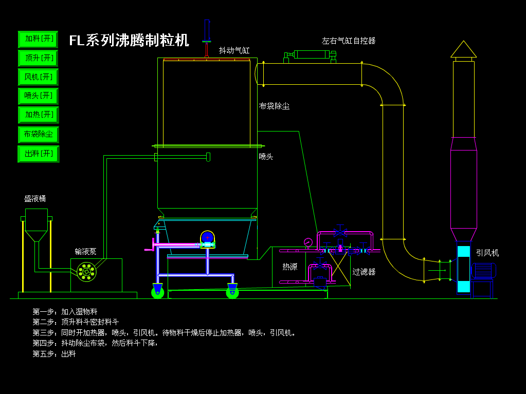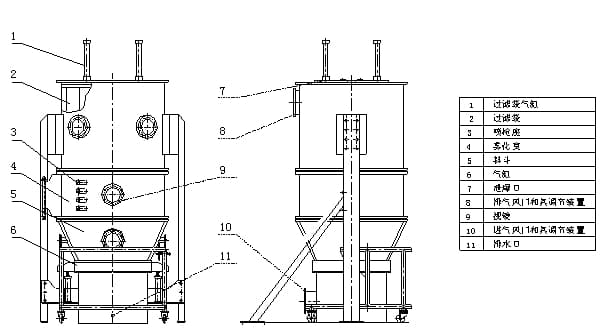 設(shè)備由流化床(原料容器)和噴霧干燥室、捕集室、頂升系統(tǒng)以及基座、霧化系統(tǒng)、加熱系統(tǒng)、空氣過(guò)濾系統(tǒng)和引風(fēng)系統(tǒng)組成。當(dāng)設(shè)備啟動(dòng)后主機(jī)各容器自動(dòng)密封,在引風(fēng)機(jī)的抽吸下,設(shè)備內(nèi)部形成一定量的負(fù)壓(可調(diào)),物料受負(fù)壓的作用,自流化床內(nèi)向上運(yùn)動(dòng)至噴霧干燥室,由于噴霧干燥室的空間較流化床大,負(fù)壓下所產(chǎn)生的氣流在此部分流速變緩,從而物料自身重力克服了負(fù)壓氣流的推力后自然下落,當(dāng)下落至一定高度后負(fù)壓產(chǎn)生的氣流推力大于物料自重時(shí)物料又向干燥室方向運(yùn)動(dòng),以此往復(fù)形成流化狀態(tài)。通過(guò)對(duì)負(fù)壓氣流的調(diào)節(jié),使物料形成良好的流化態(tài),從而達(dá)到*佳的制粒干燥效果。