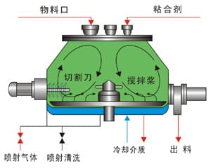1、粉狀物料從錐形料斗上方進入物料鍋,待料斗關(guān)閉后在混合槳的攪拌下,粉料在容器內(nèi)作旋轉(zhuǎn)運動,同時物料沿錐形壁方向變化,逐步生成液橋。在槳葉和筒壁對物料的擠壓、磨擦、捏合的作用下,物料逐步轉(zhuǎn)變?yōu)槭杷傻牟馁|(zhì)。然后,開啟出料門,濕顆粒在槳葉離心力作用下推動出料斗。